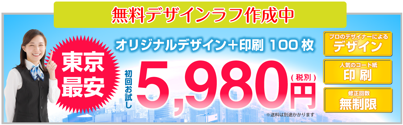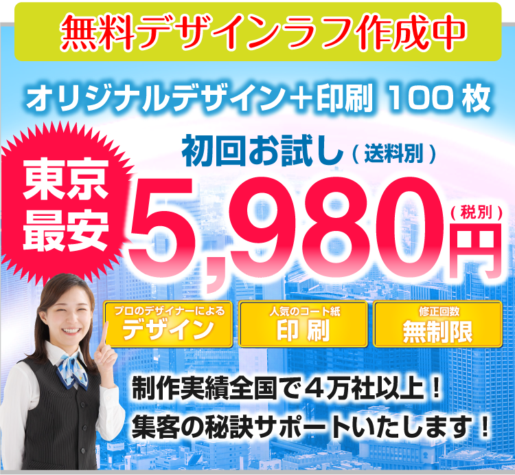 チラシデザイン作成、制作の強み 弊社の一番の強みは、低価格でハイクオリティーなチラシデザインの作成です。一般的な地元東京のデザイン会社ですと、チラシデザイン代片面で3万~4万が相場だと思います。 確かに安い業者はあるのですが、クオリティー的にプロとは言えないレベルのデザインの作成をし、一万円以下で販売もしている業者もいますが、対応のスピードや作品の質に疑問を感じます。東京チラシ作成.comではデザイナー全員が数年間の実務経験を経験しているデザイナーを多数抱えている為、低価格でのデザイン制作が可能になりました。 制作依頼前にラフデザインをご依頼者様に提出する為、お客様のイメージにより近いチラシのデザインを作成しております。よくお会いしてチラシデザインの打ち合わせをしたいというお客様もいらっしゃいますが、弊社は低価格での提供を考えておりますのでやり取りは、電話やメール、FAXなどで対応しております。また、 修正などもお客様がご納得していただくまで、何度でもチラシデザインの修正を承っております。 続いて、チラシデザインの制作スピードに関しましても、最短で当日・翌日仕上げの特急便、2~3日で完成するお急ぎ便の2種類をご用意しております。 チラシデザインの特急便はA4サイズの場合、片面34000円~でお受けしております。チラシデザインのお急ぎ便は片面25500円~でお受けしております。お急ぎの場合は、是非弊社の担当者までお気軽にお問合せいただければ幸いです。 スピードを求めないのでしたら、弊社で1番のお勧めはチラシ印刷パックをオススメしております。一番安いプランですと、チラシデザイン+印刷でA6サイズ100枚で税抜5980円からオススメしております。A4サイズでの最安パックは、チラシデザイン+印刷+送料込みで100枚で9,100円でお受けしております。 また他に何かわからないことがございましたらなんなりとお気軽にお問合せください。