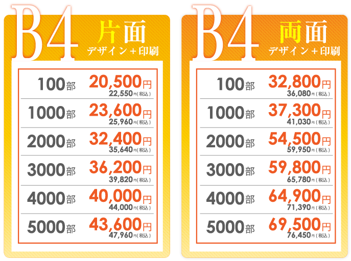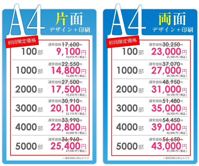 チラシデザイン作成、制作の強み 弊社の一番の強みは、低価格でハイクオリティーなチラシデザインの作成です。一般的な地元東京のデザイン会社ですと、チラシデザイン代片面で3万~4万が相場だと思います。 確かに安い業者はあるのですが、クオリティー的にプロとは言えないレベルのデザインの作成をし、一万円以下で販売もしている業者もいますが、対応のスピードや作品の質に疑問を感じます。東京チラシ作成.comではデザイナー全員が数年間の実務経験を経験しているデザイナーを多数抱えている為、低価格でのデザイン制作が可能になりました。 制作依頼前にラフデザインをご依頼者様に提出する為、お客様のイメージにより近いチラシのデザインを作成しております。よくお会いしてチラシデザインの打ち合わせをしたいというお客様もいらっしゃいますが、弊社は低価格での提供を考えておりますのでやり取りは、電話やメール、FAXなどで対応しております。また、 修正などもお客様がご納得していただくまで、何度でもチラシデザインの修正を承っております。 続いて、チラシデザインの制作スピードに関しましても、最短で当日・翌日仕上げの特急便、2~3日で完成するお急ぎ便の2種類をご用意しております。 チラシデザインの特急便はA4サイズの場合、片面34000円~でお受けしております。チラシデザインのお急ぎ便は片面25500円~でお受けしております。お急ぎの場合は、是非弊社の担当者までお気軽にお問合せいただければ幸いです。 スピードを求めないのでしたら、弊社で1番のお勧めはチラシ印刷パックをオススメしております。一番安いプランですと、チラシデザイン+印刷でA6サイズ100枚で税抜5980円からオススメしております。A4サイズでの最安パックは、チラシデザイン+印刷+送料込みで100枚で9,100円でお受けしております。 また他に何かわからないことがございましたらなんなりとお気軽にお問合せください。