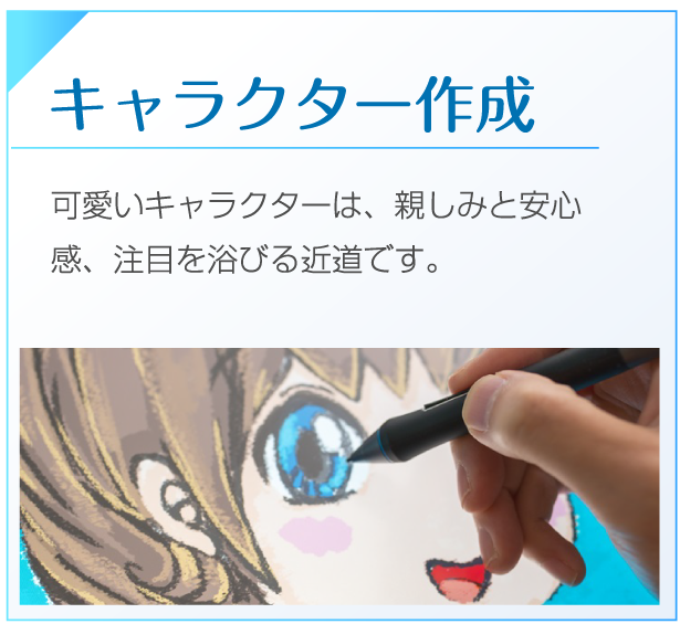 いつの時代もキャラクターは愛されています。親しみを感じるキャラクターは御社のイメージを上手に伝え、実は営業マンよりも営業してくれます。営業マン雇う前に御社のキャラクターを1つ作りませんか?