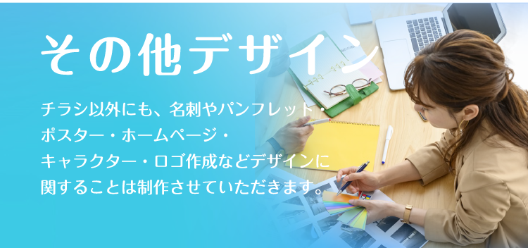 チラシ以外にも名刺作成やパンフレット、ポスター、ロゴ作成、キャラクター作成、ホームページ作成などもお受けしております。追加でご依頼の際は 一度ヒアリングをしてお客様の事を理解しておりますので、スムーズに進めることができます。