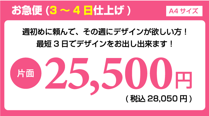 チラシデザイン作成、制作の強み 弊社の一番の強みは、低価格でハイクオリティーなチラシデザインの作成です。一般的な地元東京のデザイン会社ですと、チラシデザイン代片面で3万~4万が相場だと思います。 確かに安い業者はあるのですが、クオリティー的にプロとは言えないレベルのデザインの作成をし、一万円以下で販売もしている業者もいますが、対応のスピードや作品の質に疑問を感じます。東京チラシ作成.comではデザイナー全員が数年間の実務経験を経験しているデザイナーを多数抱えている為、低価格でのデザイン制作が可能になりました。 制作依頼前にラフデザインをご依頼者様に提出する為、お客様のイメージにより近いチラシのデザインを作成しております。よくお会いしてチラシデザインの打ち合わせをしたいというお客様もいらっしゃいますが、弊社は低価格での提供を考えておりますのでやり取りは、電話やメール、FAXなどで対応しております。また、 修正などもお客様がご納得していただくまで、何度でもチラシデザインの修正を承っております。 続いて、チラシデザインの制作スピードに関しましても、最短で当日・翌日仕上げの特急便、2~3日で完成するお急ぎ便の2種類をご用意しております。 チラシデザインの特急便はA4サイズの場合、片面34000円~でお受けしております。チラシデザインのお急ぎ便は片面25500円~でお受けしております。お急ぎの場合は、是非弊社の担当者までお気軽にお問合せいただければ幸いです。 スピードを求めないのでしたら、弊社で1番のお勧めはチラシ印刷パックをオススメしております。一番安いプランですと、チラシデザイン+印刷でA6サイズ100枚で税抜5980円からオススメしております。A4サイズでの最安パックは、チラシデザイン+印刷+送料込みで100枚で9,100円でお受けしております。 また他に何かわからないことがございましたらなんなりとお気軽にお問合せください。