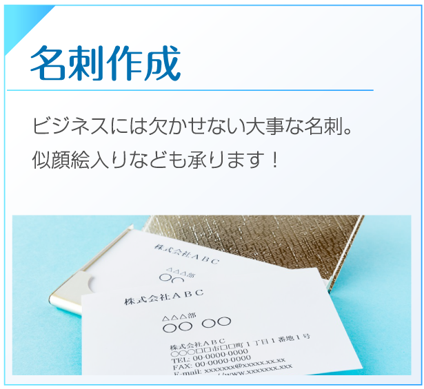 名刺は大事なあなたの顔となります。思えてもらいやすい、印象深い名刺、楽しい名刺、ネタになる名刺、もちろん似顔絵を入れた名刺だってOKですよ。ちょっとしたひと工夫が大事な縁をもたらすのです。