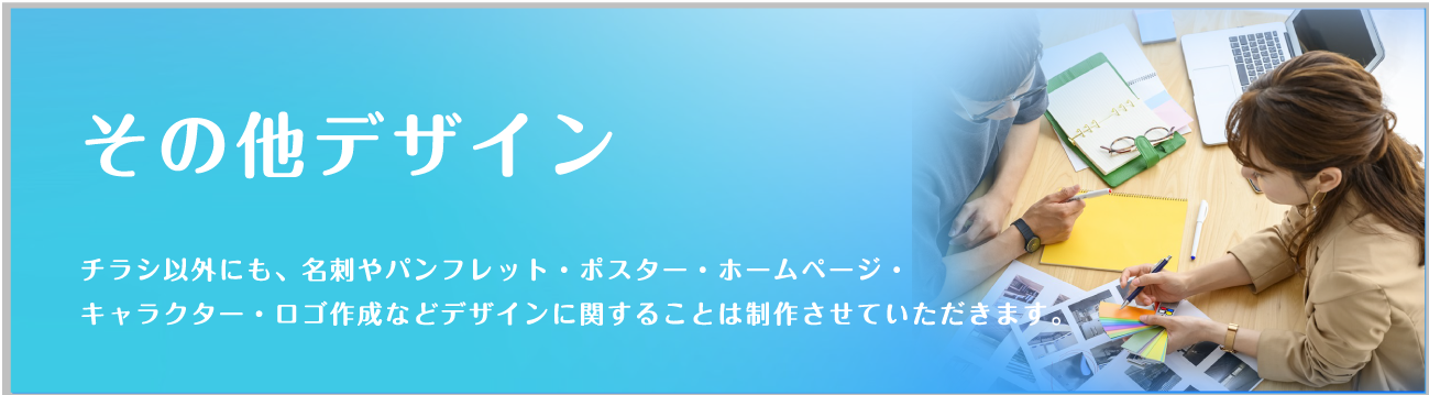 チラシ以外にも名刺作成やパンフレット、ポスター、ロゴ作成、キャラクター作成、ホームページ作成などもお受けしております。追加でご依頼の際は 一度ヒアリングをしてお客様の事を理解しておりますので、スムーズに進めることができます。